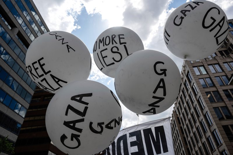 회의장 밖에는 이스라엘의 가자만행 규탄 시위대 모여들어