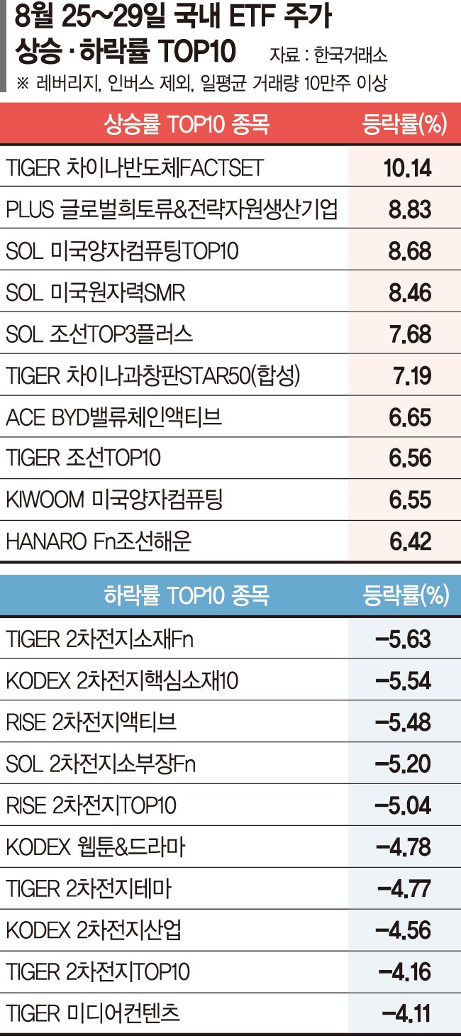 31일 한국거래소와 금융정보업체 에프앤가이드에 따르면 지난 25일부터 29일까지 국내 ETF 시장에서 가장 높은 수익률을 기록한 종목은 'TIGER 차이나반도체FACTSET'로 10.14% 급등했다. 이어 'PLUS 글로벌희토류&전략자원생산기업'이 8.83%, 'SOL 미국양자컴퓨팅TOP10'이 8.68%의 상승률을 보였다. 레버리지 및 인버스 종목과 일평균 거래량 10만주 미만 종목을 제외한 기준이다.