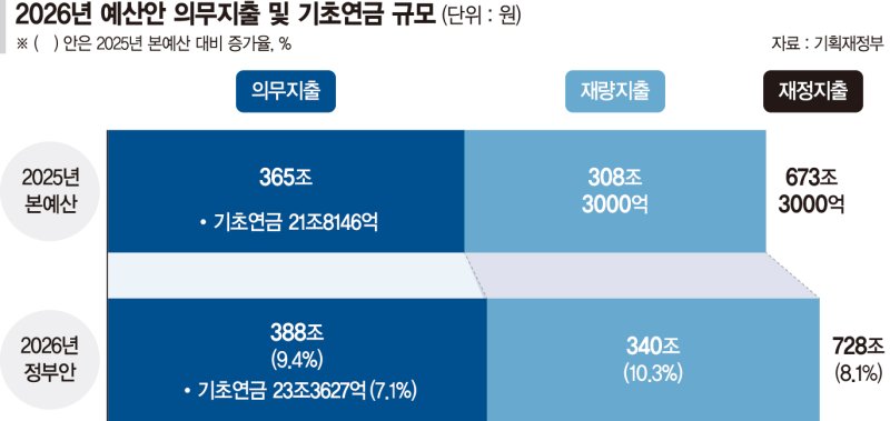 의무지출이란 국민연금·기초연금처럼 법령에 지출 근거와 규모가 명확히 규정돼 예산 편성 시 정부의 의지와 관계없이 반드시 지출해야 하는 항목이다. 의무지출이 늘어나면 재정 부담이 커지고 예산을 통한 경기 대응력은 떨어진다.