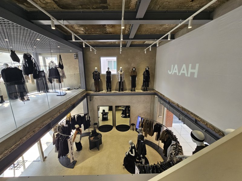 비비드한 컬러 사이 블랙, 베이지, 그레이 계열 색감으로 '세련미'와 '고급미'를 자아내는 매장이 눈길을 사로잡았다. 바로신세계인터내셔날(031430)이 최근 론칭한 여성복 브랜드 자아(JAAH) 매장이다.