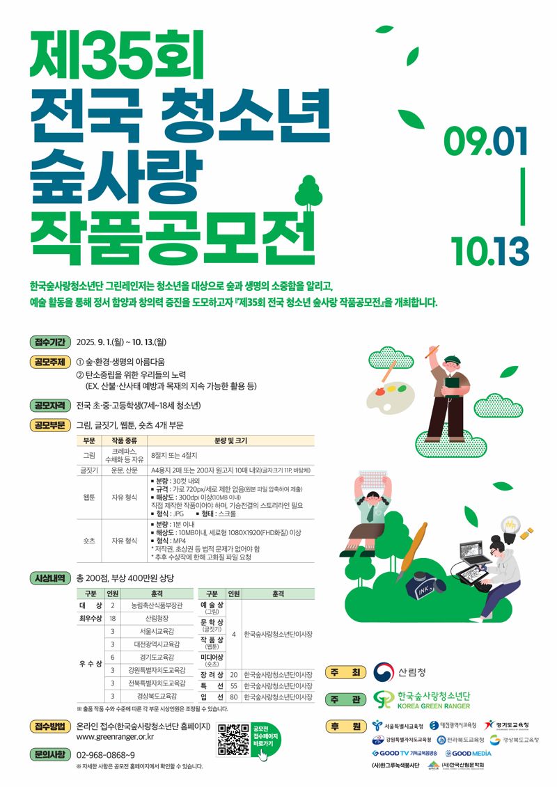 올해로 35회를 맞는 이번 공모전은 단순한 예술 활동을 넘어 기후 위기 시대를 살아가는 청소년들이 숲과 환경의 가치를 새롭게 인식하고, 이를 지켜나가는 주체로 성장하도록 돕기 위해 마련됐다.