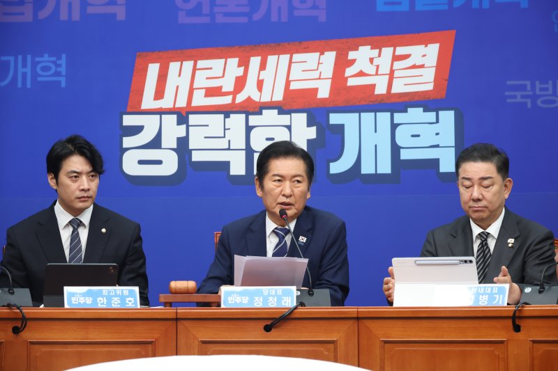 정 대표는 "이재명 정부 성공과 확실한 내란종식은 무엇이 먼저이냐를 떠질 수 없는 시대적 사명"이라며 "민생 안정과 개혁 완수는 무엇 하나 소홀히 할 수 없는 국회 책무"라고 말했다.