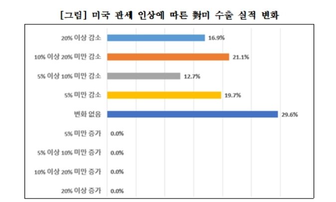 미국에 직수출하거나 현지 법인 운영 등으로 직접 영향을 받는 기업은 26.7%, 미국 수출기업에 부품이나 원자재를 납품하며 간접 영향을 받는 기업은 46.6%로 파악됐다.
