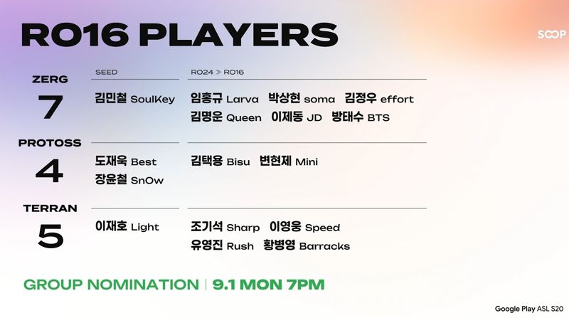 SOOP은 블리자드 엔터테인먼트의 공상 과학 RTS 게임 ‘스타크래프트: 리마스터’로 진행되는 e스포츠 리그 ‘구글 플레이 ASL 시즌20’의 16강 조지명식을 1일 진행한다고 밝혔다.
