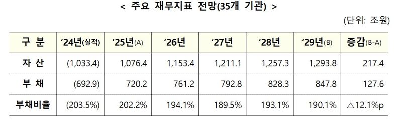 같은 기간 총 자산도 2029년 1293조8000억원으로 올해보다 217조4000억원 증가한다. 이에 따라 부채비율은 2025년 202.2%에서 2029년 190.1%로 12.1%포인트 낮아질 것이라는 게 정부 설명이다.