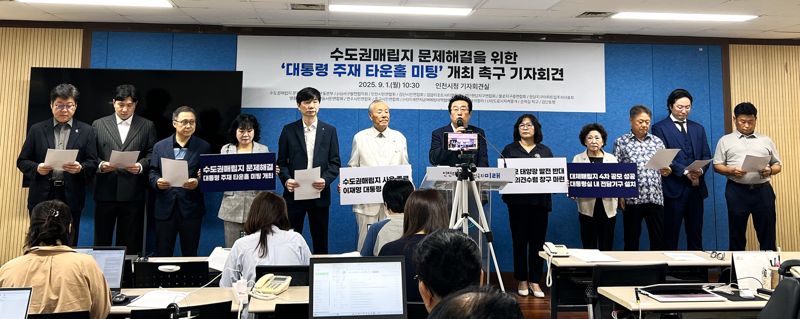 수도권매립지 문제해결 범시민운동본부와 검단·서구 주민단체들은 1일 인천시청에서 기자회견을 열고 수도권매립지 문제 해결을 위해 대통령 주재 타운홀 미팅 개최를 촉구했다.