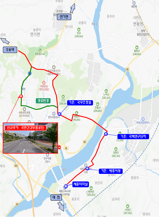 시외버스 노선은 세종터미널, 세종시청, 국책연구단지, 국무조정실, 죽전정류장(경부고속도로)을 거쳐 서울경부터미널로 향하는 기존 노선에 국민건강보험공단(아름동·고운동) 정류소가 추가됐다.