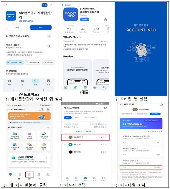 금감원은 2일부터 금융결제원 어카운트인포 애플리케이션이나 계좌정보통합관리서비스 웹사이트에서 ‘내 카드 한눈에’ 서비스 이용이 가능하다고 이날 전했다.