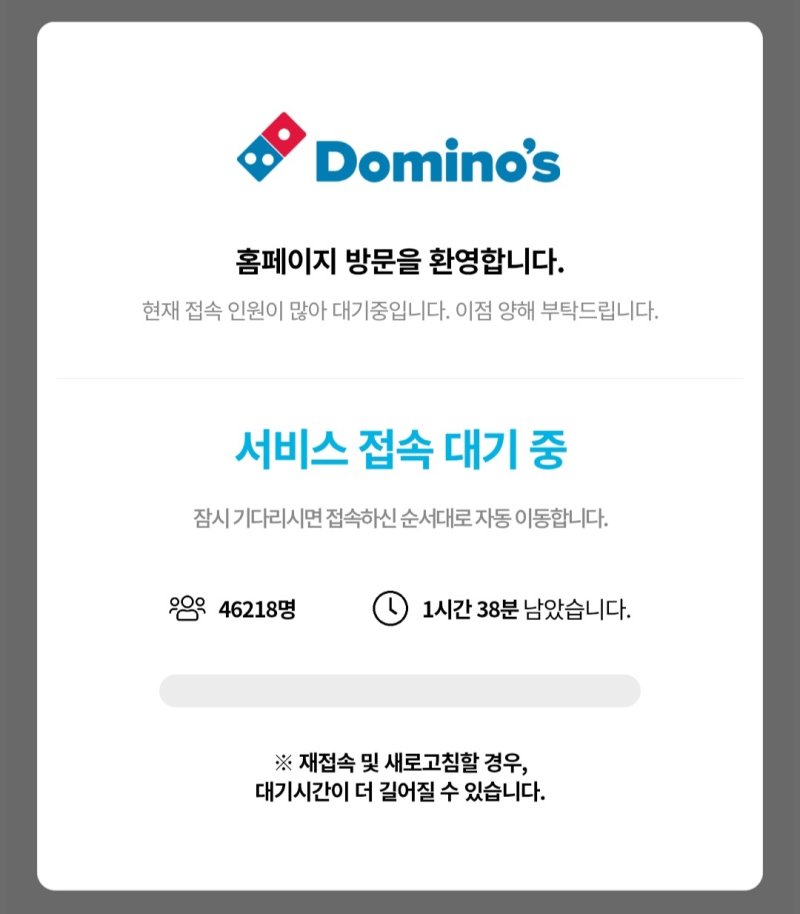 쿠폰 사용 기간을 늘렸는데도 지난달 31일 기준 도미노피자 홈페이지는 접속 대기열이 4만 6000명을 돌파하는 등 고객이 몰렸다. 주문을 위한 홈페이지 접속에만 1시간 30분이 넘게 걸렸다.