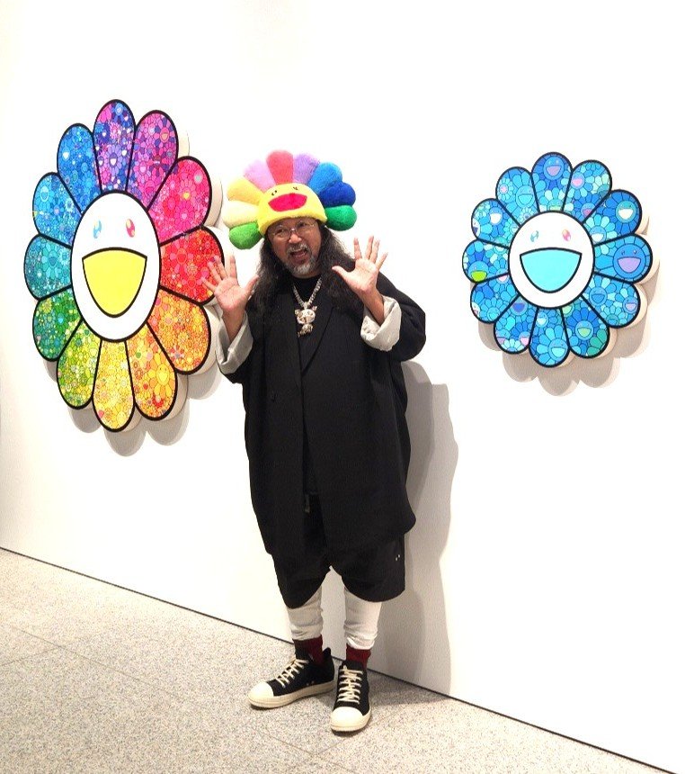 [서울=뉴시스] 박현주 미술전문 기자 = '일본 팝아트 황제' 무라카미 다카시(63)가 ‘활짝 웃는 꽃’처럼 알록달록한 모자를 쓰고 나타났다. 세속의 기준이라면 다소 우스꽝스러운 행색이지만, ‘슈퍼플랫(Superflat)’ 미학으로 세계 미술계를 장악한 예술가에게는 그 자체로 또 하나의 작품이 된다.