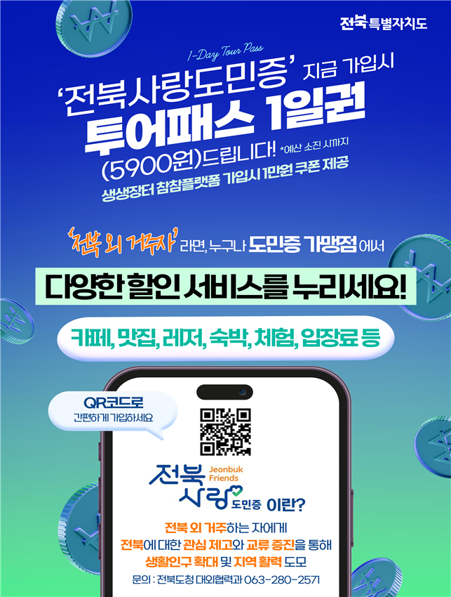 한편 전북사랑도민증은 전북 외 거주자면 누구나 가입할 수 있다. 임실 붕어섬, 남원 광한루원 등 350여곳에서 사용 가능한 ‘투어패스 1일권’과 생생장터·참참 플랫폼 연계 1만원 할인쿠폰이 제공된다. 음식점·카페·스키장 등 206개 가맹점에서 다양한 할인 혜택을 누릴 수 있다.