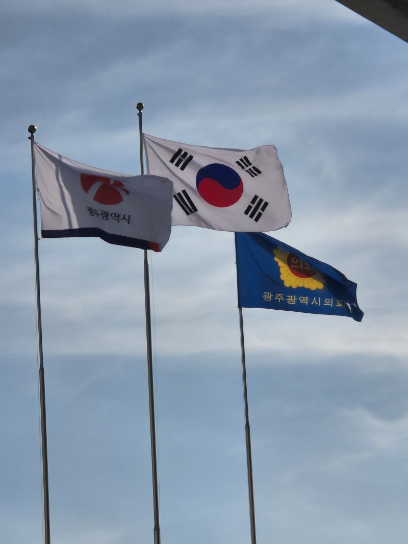 1일 <뉴스1> 취재를 종합하면 이날 광주시의회 청사 앞 국기 게양대에 태극기가 거꾸로 게양돼 있었다. 태극기 양측에 걸린 광주시청 기와 광주시의회 기는 정상이었다.