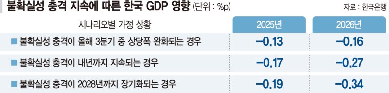 최악의 상황으로 트럼프 2기 내내, 즉 오는 2028년까지 관세협상이 타결되지 않고 불확실성이 장기화될 경우 올해와 내년 성장률을 0.19%p, 0.34%p 갉아먹게 된다. 이창용 한은 총재가 지난달 28일 "2차 추경 등이 성장률을 0.2%p 높이는 요인으로 작용했다"고 설명한 점을 감안하면 경기부양을 위한 재정 확장 정책의 효과를 통상환경의 불확실성이 상쇄하는 셈이다.