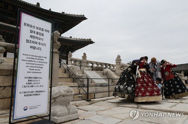 경복궁관리소 관계자는 "성수기를 맞아 많은 관람객으로 근정전 돌난간 등 석조물의 손상이 우려된다"며 "문화유산의 보존 관리에 협조해달라"고 당부했다.