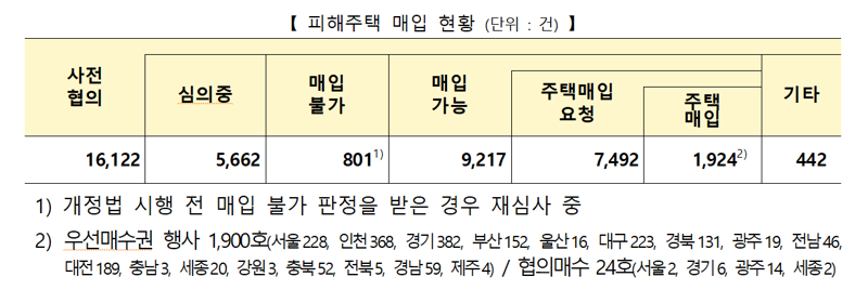 국토부에 따르면 전세사기 피해자들로부터 접수된 매입 사전협의 요청은 지난달 26일 기준 1만6122건에 달한다. 이 중 현장조사와 심의를 거쳐 9217건이 매입 가능 판정을 받았고, 지금까지 협의·경매 등을 통해 실제 매입이 완료된 주택은 총 1924가구다.
