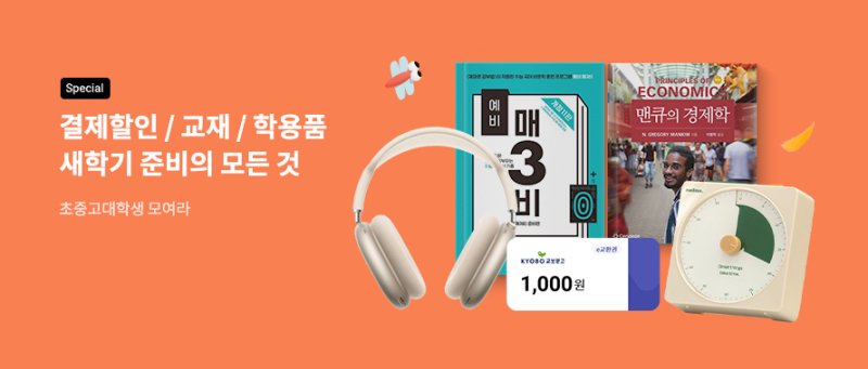 또한 2만원 이상 구매 시 '어린이 스터디 플래너', 3만원 이상 구매 시 '필통 키트'를 증정해 신학기 준비를 돕는다. 초·중·고 학년별 국·영·수 참고서를 엄선한 기획전도 진행되며, 구매 금액에 따라 한정판 굿즈를 제공한다.
