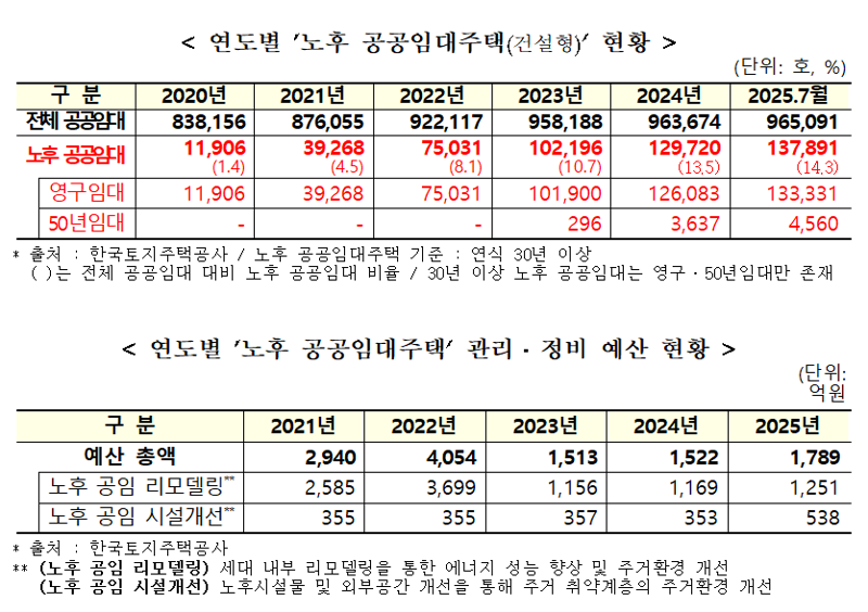 노후 공공임대주택이 크게 늘었지만 관리·정비 예산은 쪼그라든 상태이다. 2022년 4054억원이었으나 전임 윤석열 정부가 2023년 1513억원으로 대폭 삭감했고, 올해 1789억원으로 제자리걸음이다.