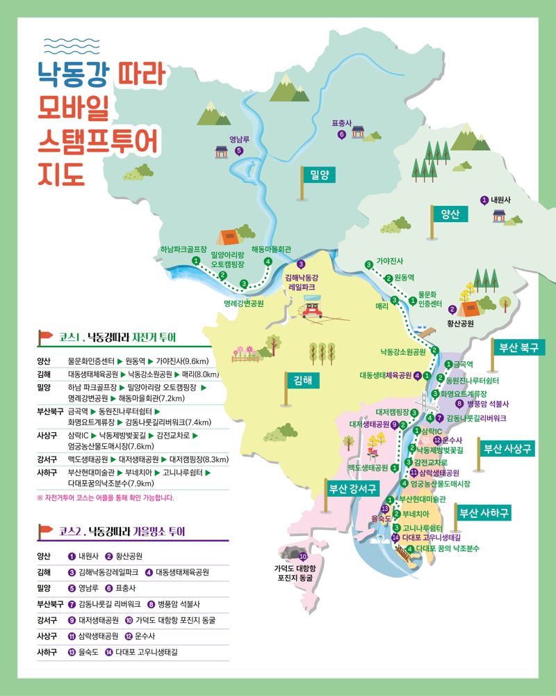명소는 사하구 을숙도 피크닉광장·다대포 고우니생태길, 사상구 삼락생태공원·운수사, 강서구 대저생태공원·가덕도 대항항 포진지 동굴, 북구 감동나룻길 리버워크·병풍암 석불사 등이다. 또 경남은 김해시 낙동강레일파크·대동생태체육공원, 양산시 내원사·황산공원, 밀양시 영남루·표충사 등이다.