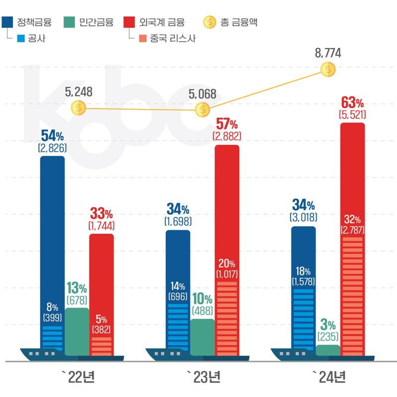 이는 공사가 국적선사 금융조달 현황을 집계하기 시작한 2021년 이래 최대 규모로, 연 집행금액은 전년 대비 약 57.76%(37억 600여만 달러) 늘어났다. 구체적인 지원 항목은 외국계 금융이 55억 2100여만 달러(63%)로 가장 높은 비중을 차지했으며 이어 정책금융 30억 1800여만 달러(34%), 민간금융 2억 3500여만 달러(3%) 등이다.