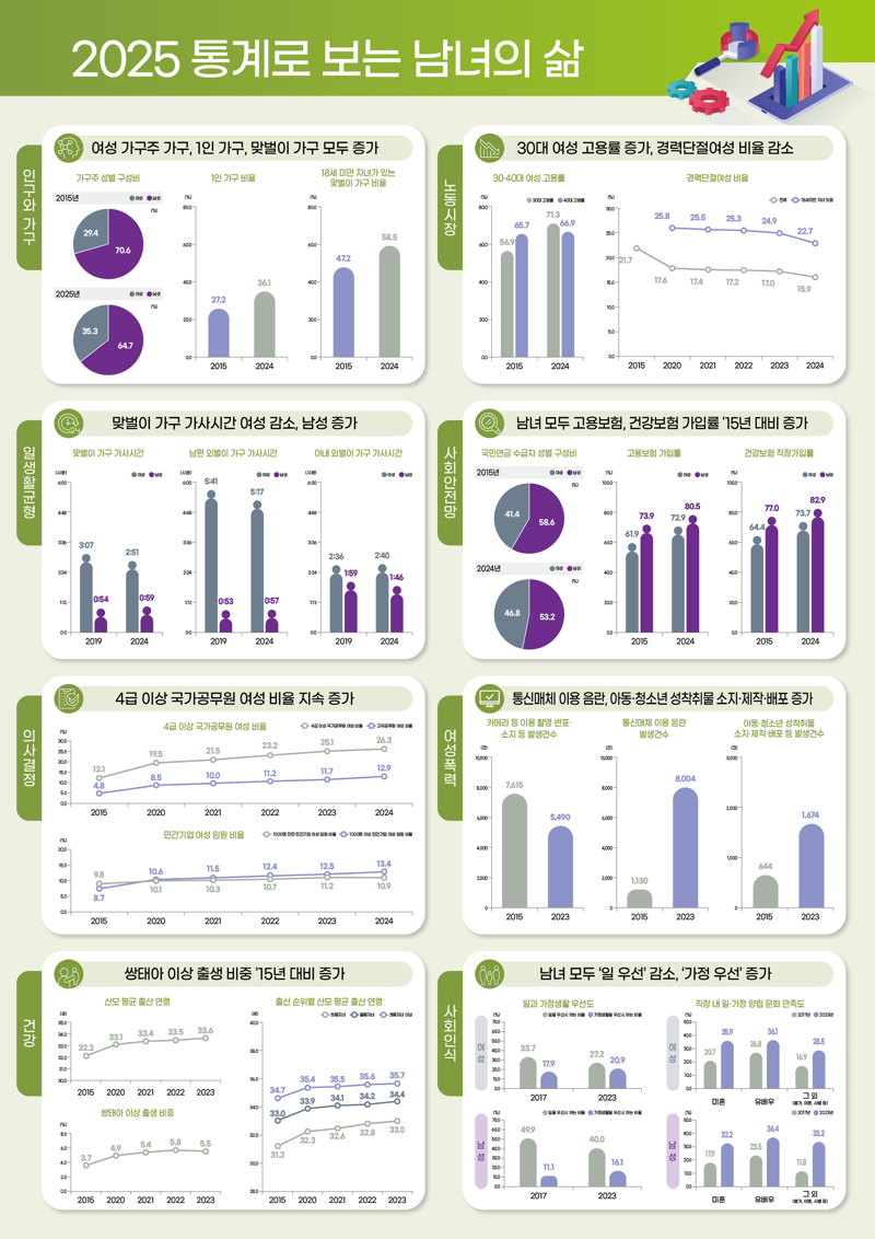 2일 여성가족부가 내놓은 '2025 통계로 보는 남녀의 삶' 보고서에 따르면 지난해 15∼64세 여성 고용률은 62.1%, 남성은 76.8%로 2015년 대비 각 6.4p, 0.9p 상승했다. 남성 고용률이 소폭 상승한 것에 비하면 여성 고용률은 괄목할 만한 성과다. 특히 30대 초반 여성 고용률은 73.5%로 2015년 59.6% 대비 13.9p 상승해 눈길을 끌었다.