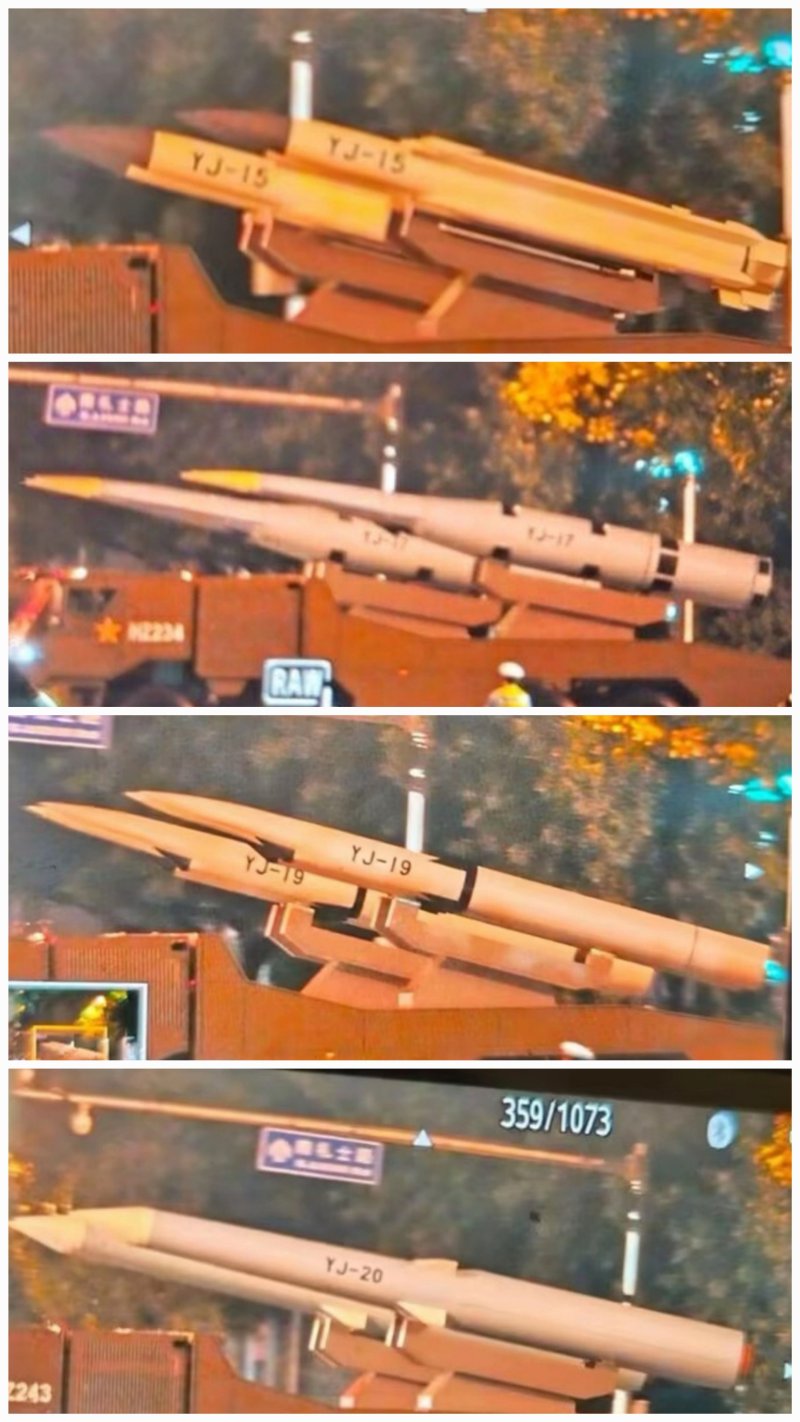 이 밖에도 공중발사 미사일인 'YJ-15', 극초음속 미사일인 'YJ-19', 'YJ-20', 새로운 전차와 전투기, 드론 등이 새롭게 공개될 것으로 예상된다.