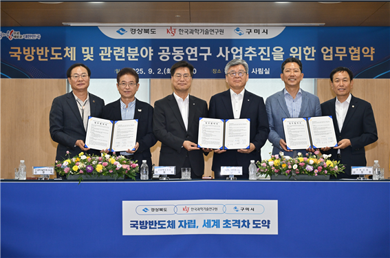 [파이낸셜뉴스] 국가과학기술연구회(NST) 산하 한국과학기술연구원(KIST)은 2일 경상북도 도청 회의실에서 오상록 원장, 이철우 경상북도지사, 김장호 구미시장, 김영식 NST 이사장 등 주요 인사가 참석한 가운데 '국방 반도체 및 관련 분야 공동연구사업' 추진을 위한 ‘KIST-경상북도-구미시’ 3자 업무협약(MOU)을 체결했다고 밝혔다.이번 협약은 KIST의 세계적인 연구 역량, 경상북도의 전략적 지원, 구미의 탄탄한 산업 기반이 하나로 모여 차세대 성장동력으로 급부상하는 국방 반도체 분야를 선제적으로 대응하고, 기술의 자립화를 위한 실질적인 기반을 다지는 데 중요한 이정표가 될 것이라는 기대다.
