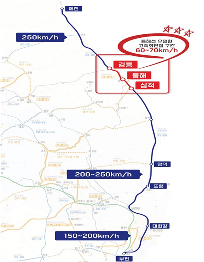 사업이 완료되면 철도 이동 시간이 최대 1시간40분 단축되며 강릉~부산 구간은 현재 5시간대에서 3시간20분으로 크게 단축돼 환동해권 접근성과 물류 경쟁력이 획기적으로 향상될 것으로 전망된다.