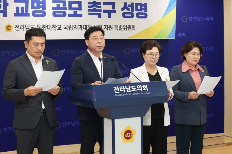 (무안=연합뉴스) 형민우 기자 = 전남도의회는 2일 "전남 의과대학 설립을 위해 국립 목포대와 국립 순천대의 통합대학 교명 공모를 조속히 추진하라"고 촉구했다.
