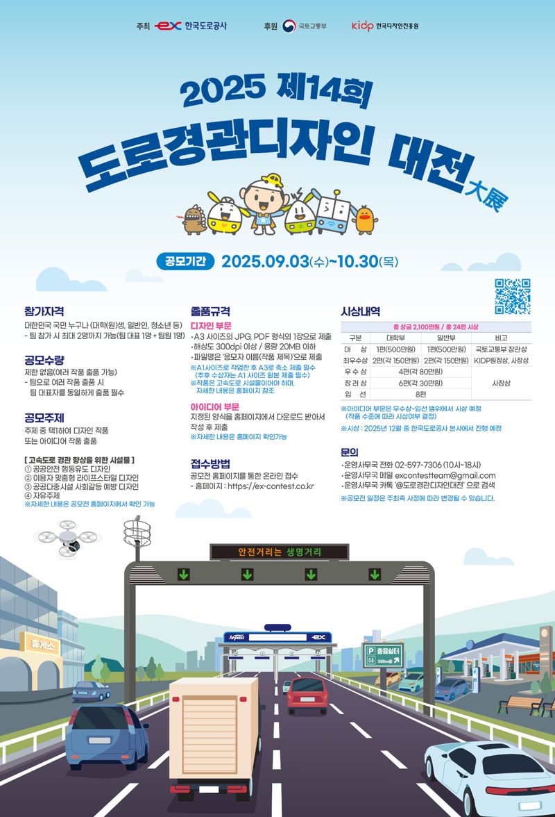 심사는 대학부와 일반부로 나눠 11월 진행되며, 12월에 부문별 대상 1편(국토교통부 장관상·상금 500만원), 최우수상 2편(한국도로공사 사장상·한국디자인진흥원 원장상·상금 150만원) 등 총 24편을 선정한다. 총상금은 2100만원 규모다.