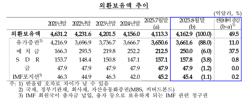 3일 한국은행에 따르면 2025년 8월 말 기준 우리나라 외환보유액은 4162억9000만달러로, 지난 7월(4113억3000만달러)보다 49억5000만달러 증가했다. 올해 1월(4110억1000만달러)부터 4개월 연속 4100억달러를 하회한 뒤, 지난 5월에 2020년 4월(4049억8000만달러) 이후 가장 적은 수준까지 떨어졌던 외환보유액은 6월에 이어 석 달 연속으로 4100억달러를 상회했다.