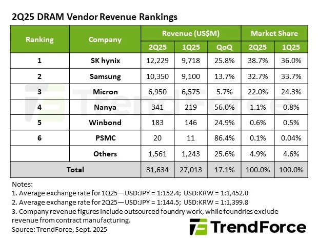 올해 2분기 전세계 D램 전체 매출은 전 분기 대비 17.1% 성장한 316억3000만 달러(44조원)를 기록했다. 이는 D램 가격 상승 및 견조한 출하량 증가, HBM 수요 증가 영향이라고 트렌드포스는 전했다.