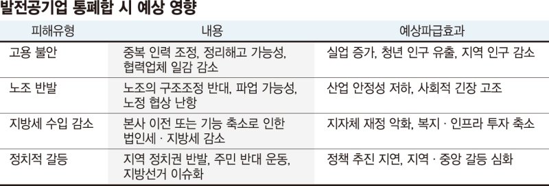지역사회의 반대도 예상된다. 발전공기업 본사가 위치한 지방자치단체는 법인세·지방세 수입에 크게 의존하고 있다. 통폐합으로 본사 이전 시 지방 세수에 대한 악영향을 피할 수 없다.