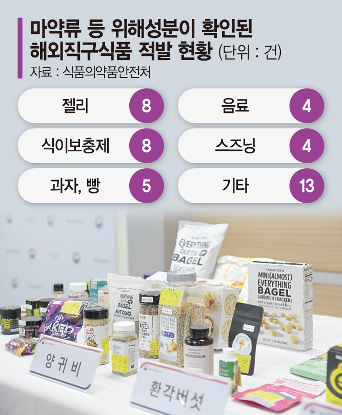 이중 양귀비 성분인 모르핀, 코데인, 테바인과 환각버섯 성분인 사일로신이 검출된 것은 처음이다. 적발된 해외직구식품 유통업체 중에는 미국 유명 잡화점 트레이더 조 등도 포함됐다. 식약처는 모르핀과 코데인, 테바인, 사일로신을 국내 반입 차단 대상 원료·성분으로 신규 지정·공고했다.
