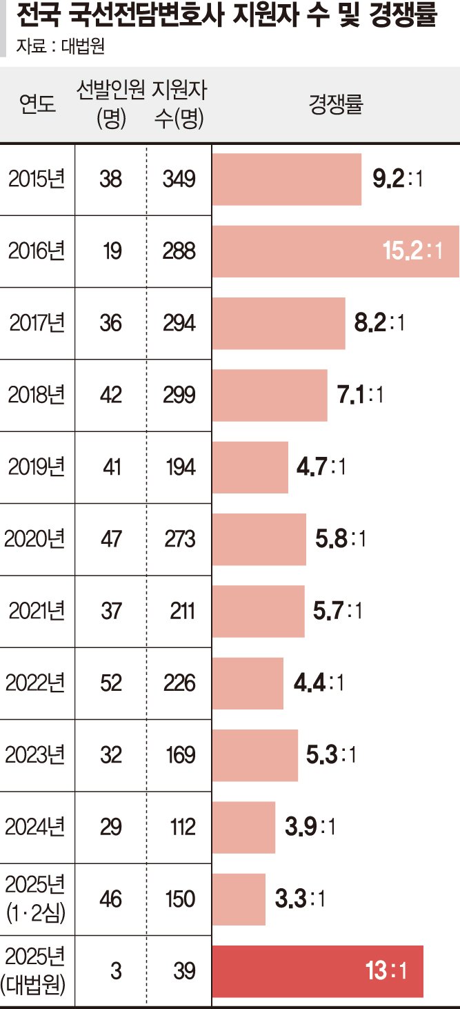 2일 파이낸셜뉴스 취재를 종합하면 이달부터 근무하는 올해 대법원 국선전담변호사 채용에는 39명이 지원해 최종 3명이 선발됐다. 경쟁률은 13대1로, 올해 초 1·2심 국선전담변호사 경쟁률(3.3대1)의 4배 수준이다.