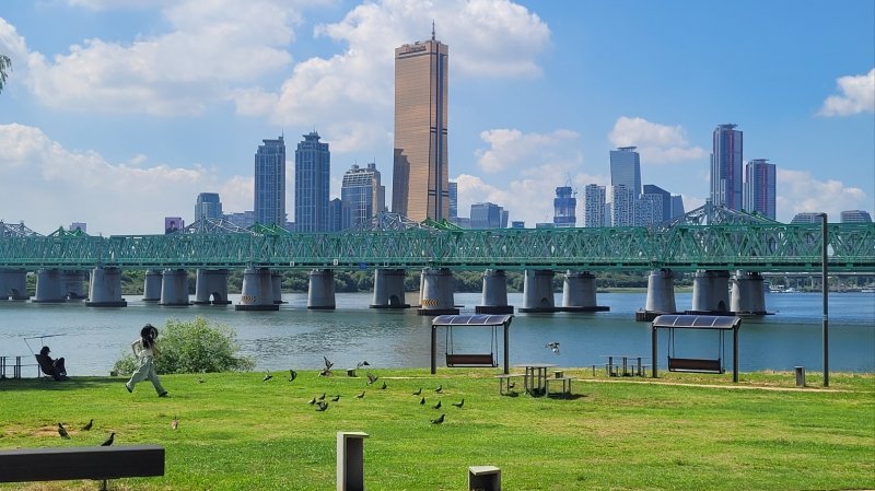 (서울=뉴스1) 이정환 기자 = 지난 2일 오후 1시쯤 서울 용산구 노들섬에는 평일 오후에도 양산을 쓴 방문객들의 발걸음이 이어졌다. '노을 명소'로 유명한 섬 서쪽 수변부 공원에는 방문객들이 삼삼오오 잔디밭에 돗자리를 깔고 한강철교를 바라보며 여유를 즐기고 있었다.