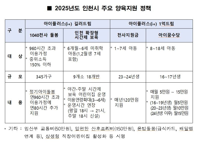 시는 이미 ‘아이플러스(i+) 길러드림’ 사업을 통해 선제적인 돌봄정책을 운영 중이다. 정부 지원 한도 연간 960시간을 초과한 가정에 연간 80시간의 돌봄을 추가 지원하는 ‘1040천사 돌봄’을 비롯해 이른 아침부터 늦은 저녁(오전 7시 30분~오후 9시)·주말(오전 9시~오후 6시) 긴급 돌봄을 위한 ‘인천 확장형 시간제 보육’ 등이 대표적이다.