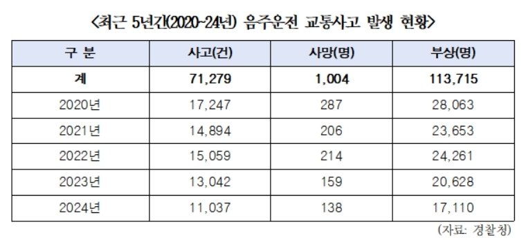 3일 한병도 더불어민주당 의원(전북 익산을)이 경찰청으로부터 받은 자료에 따르면 2020년부터 2024년까지 5년간 전국에서 7만1279건의 음주운전 교통사고가 발생해 1004명이 숨지고 11만3715명이 다쳤다.