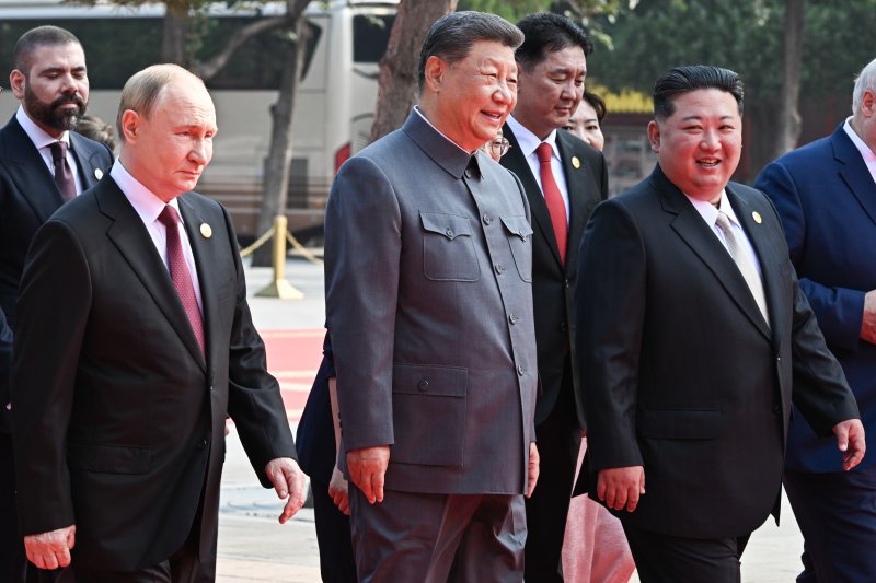 이날 열병식에는 블라디미르 푸틴 러시아 대통령과 북한 김정은 국무위원장도 참석했으며 푸틴은 시진핑 중국 국가주석의 오른쪽, 김정은은 왼쪽에 자리했다.