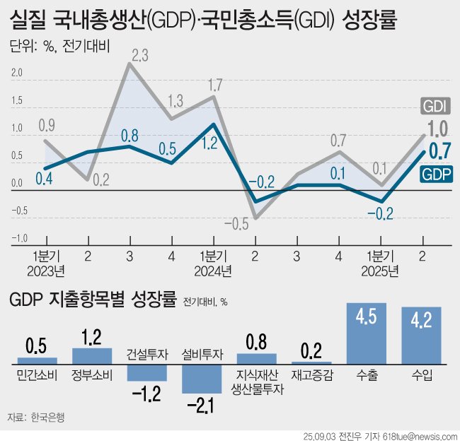 한은이 3일 발표한 '2025년 2분기 및 연간 국민소득(잠정)'에 따르면 우리나라의 올해 2분기 실질 GDP 잠정치는 전기대비 0.7% 증가했다. 소수점 둘째자리로는 0.67%다. 전년 동기 대비 성장률은 0.6%로 나타났다. 상반기 전체 성장률은 0.3% 를 기록했다.