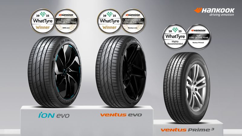 한국타이어는 영국 타이어 전문 매체 '왓타이어'가 주관하는 '2025 왓타이어 어워드'에서 '아이온 에보'가 '올해의 전기차 타이어', '벤투스 에보'가 '올해의 퍼포먼스 타이어' 부문을 각각 수상했다고 3일 밝혔다.