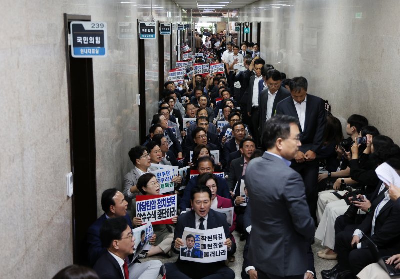 국민의힘 의원들은 압수수색영장을 통한 강제수사에 반발해 원내대표실 앞에서 긴급 의원총회를 열고 농성을 벌이고 있다. 특검팀은 지난 2일에도 이들 장소에 대한 압수수색을 시도했지만, 국민의힘 측의 반발로 영장을 집행하지 못하고 철수했다.