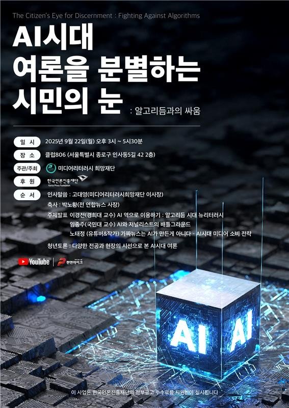 (서울=연합뉴스) 이세원 기자 = 미디어리터러시희망재단은 22일 오후 3시 서울 종로구 클럽806에서 'AI시대, 여론을 분별하는 시민의 눈 : 알고리듬과의 싸움'을 주제로 세미나를 연다고 3일 밝혔다.