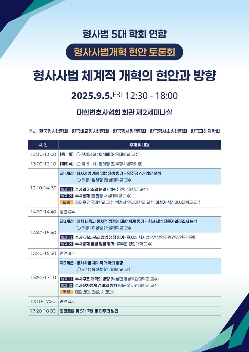 '형사사법의 체계적 개혁 현안과 방향'을 주제로 열리는 이번 행사는 오는 4일 국회 법제사법위원회의 검찰청 폐지와 수사·기소권 분리 추진 관련 공청회, 오는 5일 관련 정부조직법 개정안 발의 일정에 맞춰 이뤄진다. 추진 법안에 대한 학문적·정책적 평가, 학계 전문가 대상 개혁쟁점별 설문 조사 분석, 형사사법개혁 내용과 절차에 대한 대안적 관점을 토론한다.