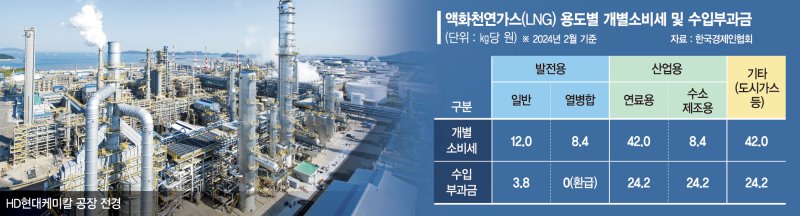 HD현대케미칼 관계자는 "석유화학 업황 부진을 고려할 때 발전용뿐 아니라 연료용 LNG에 부과되는 개별소비세·석유수입부과금·안전관리부담금 등 각종 세금과 부담금에 대한 완화가 필요하다"고 설명했다.
