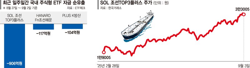 3일 코스콤 ETF체크에 따르면 'SOL 조선TOP3플러스' ETF는 지난 일주일(8월27일~9월2일) 동안 906억원의 자금이 순유출됐다. 이는 국내 상장 전체 ETF 중 자금 유출 규모 1위다. 같은 기간 'HANARO Fn조선해운'도 117억원이 빠져나가면서 주식형 ETF 중 자금 순유출 6위에 이름을 올렸다.