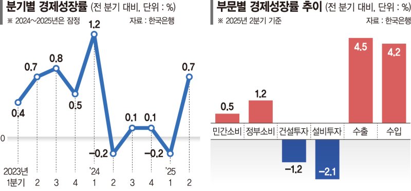 2·4분기 성장률을 부문별로 보면 민간소비가 승용차·의료 등을 중심으로 0.5% 늘었다. 정부소비도 건강보험 급여비 위주로 1.2% 증가했다. 수출은 반도체, 석유·화학제품 등이 늘어 4.5% 상향됐고, 수입은 에너지류(원유, 천연가스 등)를 중심으로 4.2% 높아졌다. 각각 2020년 3·4분기(14.6%), 2021년 1·4분기(5.3%) 이후 최고치다.