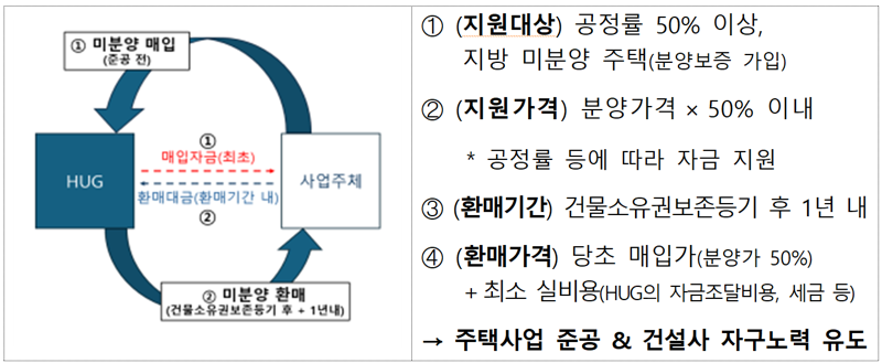 안심환매 사업은 지방 분양보증 사업장에서 공정률 50% 이상인 주택을 대상으로 한다. 주택도시보증공사(HUG)가 준공 전 미분양 주택의 분양가 최대 50%를 지원하고, 준공 이후 1년 내 건설사가 환매할 수 있는 권리를 부여한다. 이를 통해 건설사는 할인 분양 등 자구책을 마련하고, 사업장은 안정적으로 준공을 이어갈 수 있게 된다.