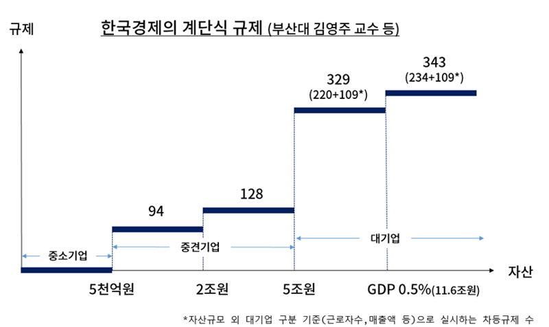 실제로 이날 대한상의와 김영주 부산대 교수 연구팀이 수행해 발표한 ‘차등규제 전수조사’ 결과를 보면 경제 관련 12개 법안에만 343개의 기업별 차등 규제가 있었다. 중소기업에서 중견기업이 되는 순간 94개의 규제가 늘고, 대기업이 되면 329개까지 급증했다. 경제형벌 관련 조항은 약 6000여개에 이르는 것으로 알려졌다.