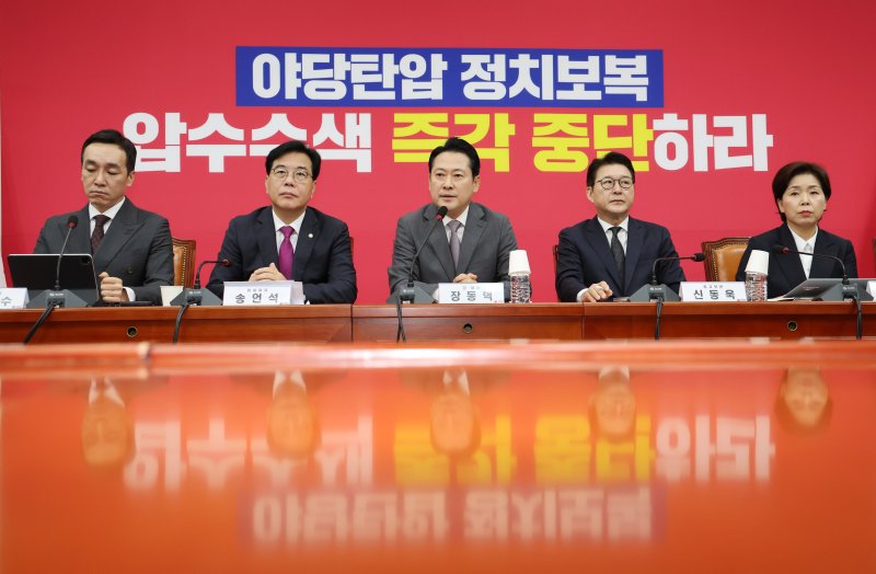 송언석 원내대표는 "특검이 제시한 압수수색 영장은 법치의 기본적인 사안을 완전히 무시한 영장"이라며 "수사가 아니라 저급한 폭력"이라고 했다.