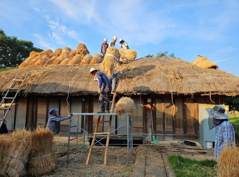 4일 순천시에 따르면 낙안읍성의 초가이엉이기 작업은 낙안읍성에서 거주하는 전통기술보유 주민들이 참여해 벼 수확 시기에 맞춰 매년 진행된다.